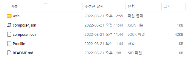 예제로 다운로드한 php-getting-started 폴더에서 방금 자신의 컴퓨터에 clone한 폴더(ez-learning-python)로 composer.json, composer.lock, Procfile를 복사합니다. 또한 web이라는 폴더도 하나 만듭니다.